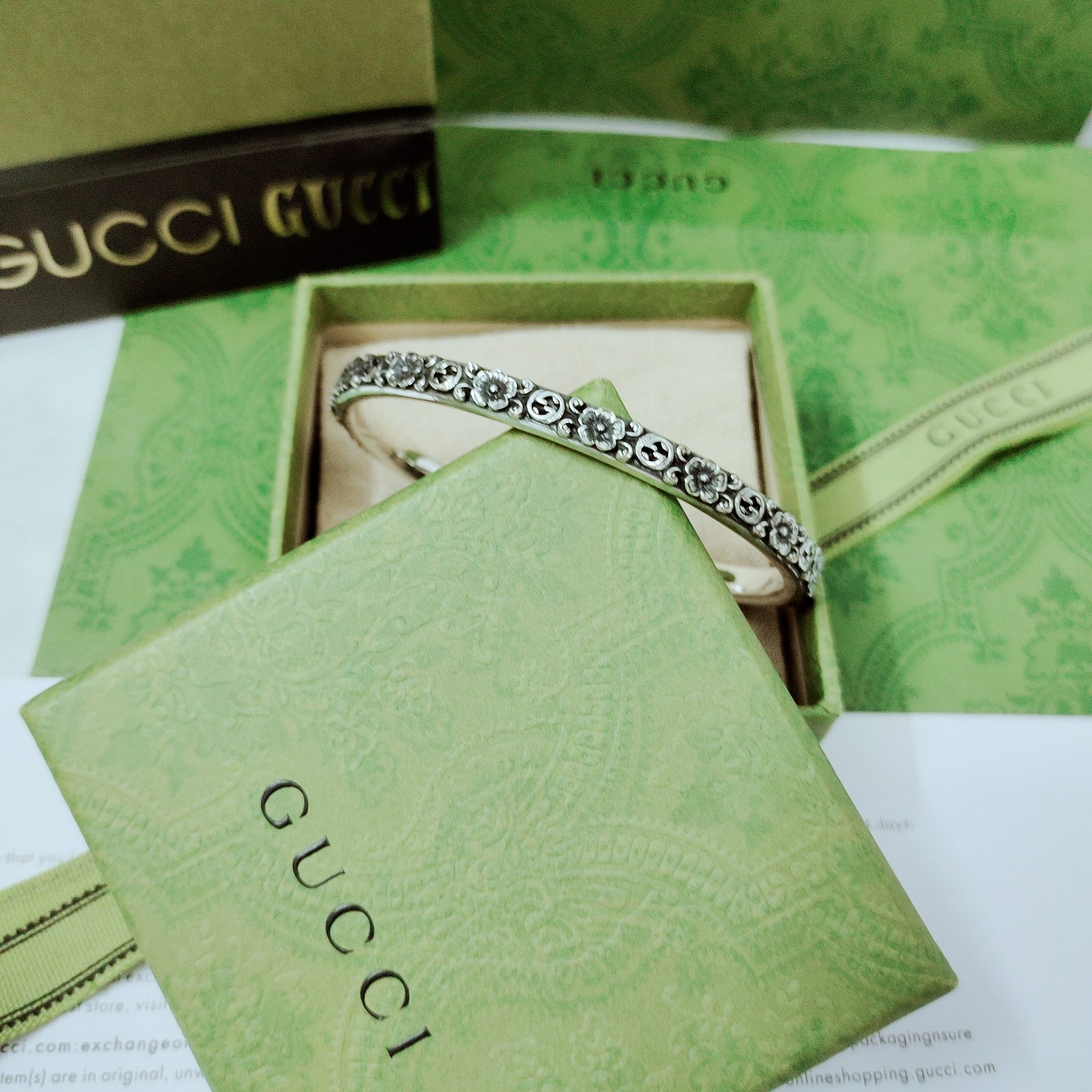𝐆𝐮𝐜𝐜𝐢 Hollow Flower Green Resin Gemstone Double G Pattern Bracelet