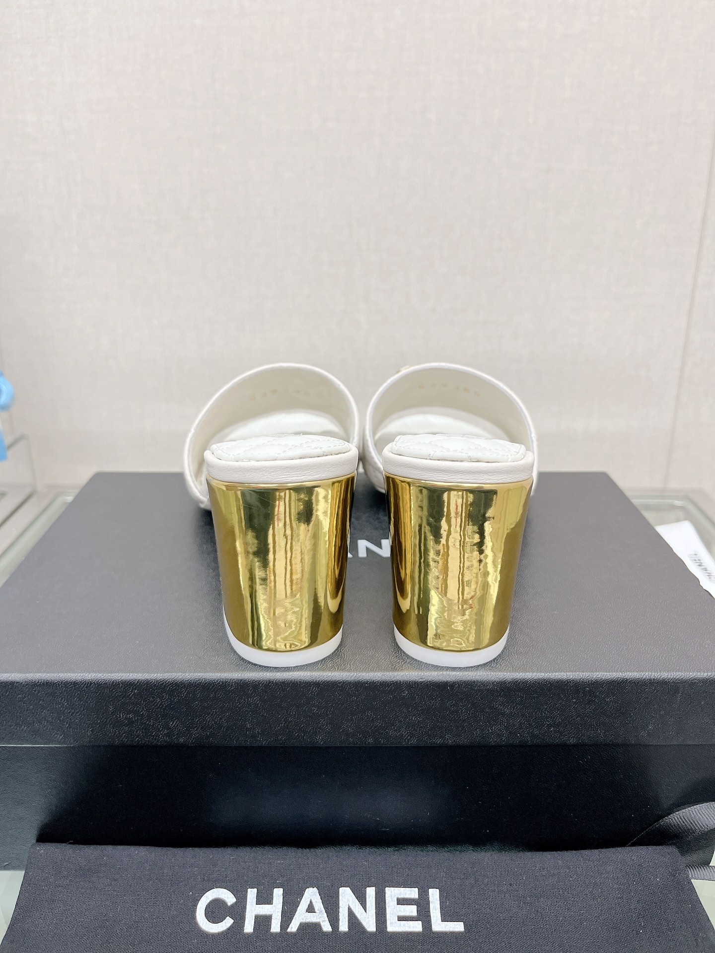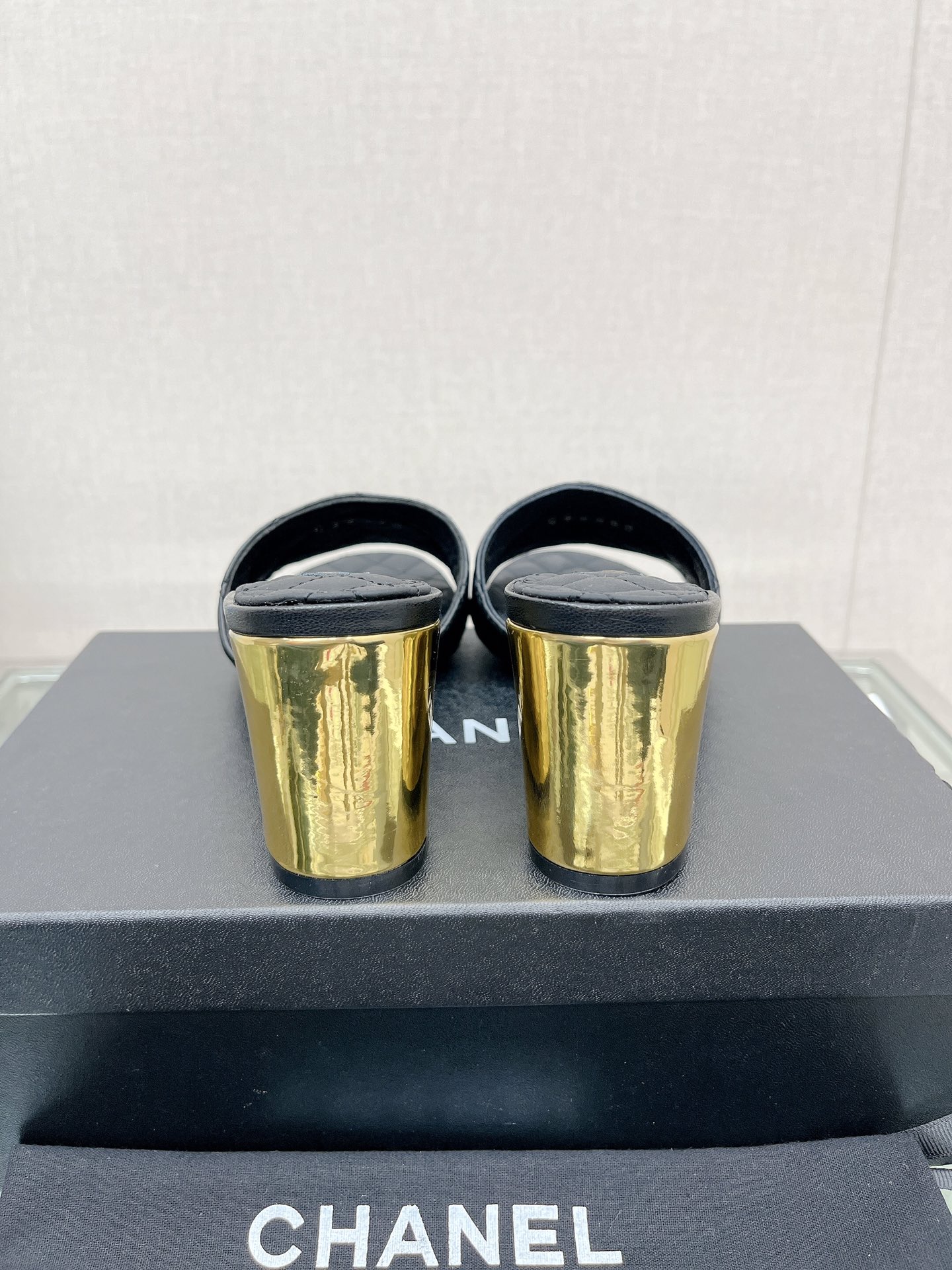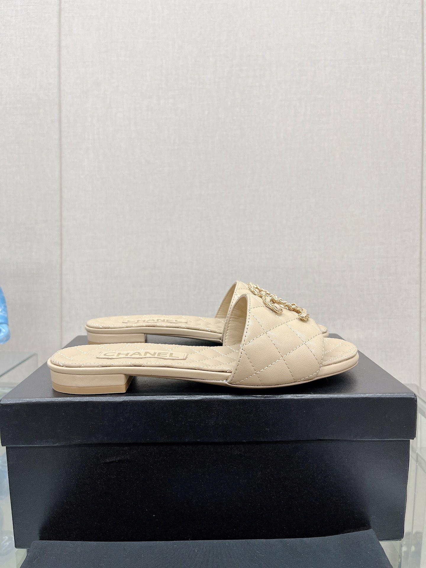 CHANEL 23Ss new diamond check chain double C buckle metal heel slippers sheepskin lining