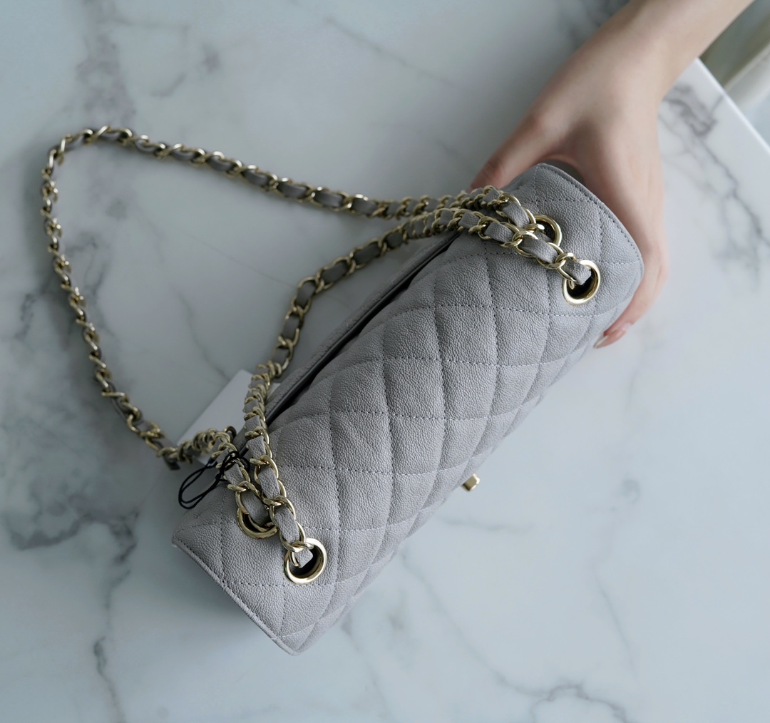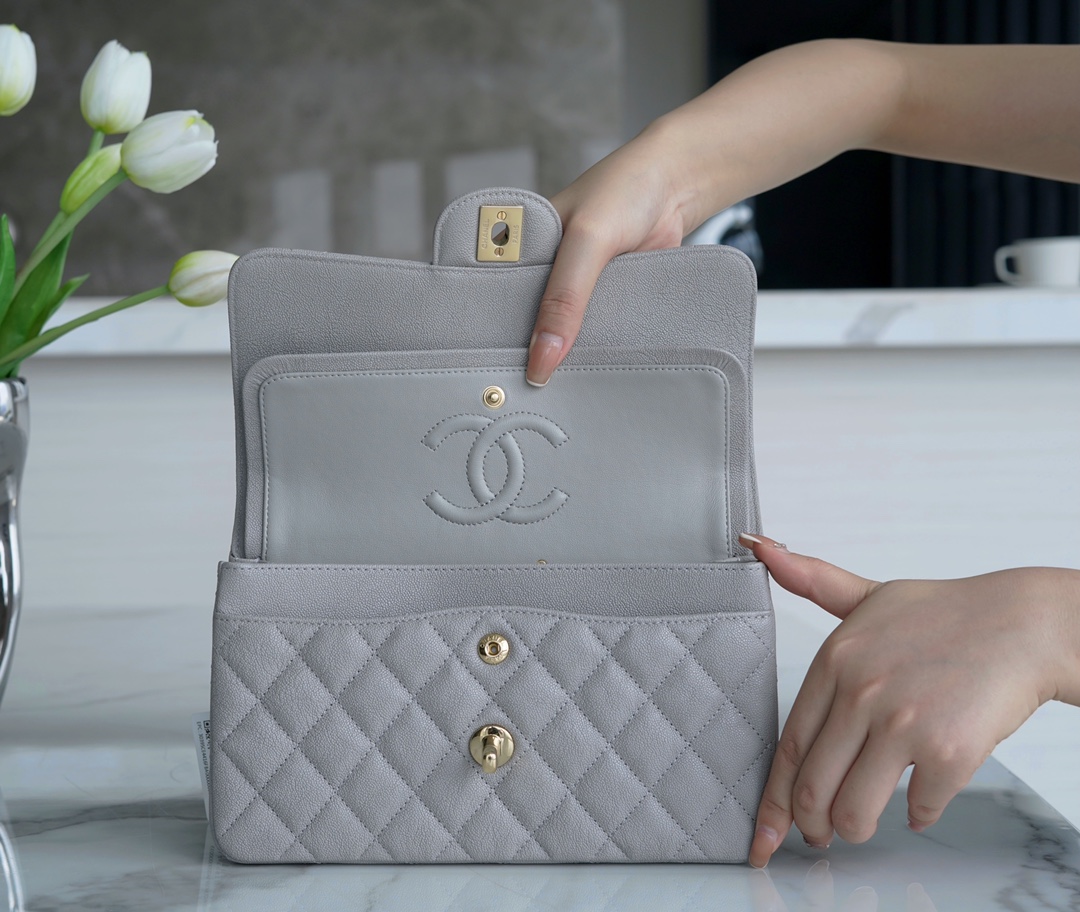𝐂𝐇𝐀𝐍𝐄𝐋 Classic Flap France 🇫🇷 𝐇𝐚𝐚𝐬Original Caviar 🐂Water Fetal Calf Small 🐘Light Gray