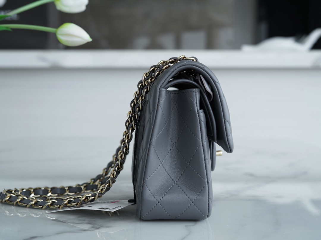 𝐂𝐇𝐀𝐍𝐄𝐋 Classic Flap Italy 🇮🇹 "𝗚𝗥" Original Lambskin 🐑 Classic Mouth Flap Bag Small 🔆 Dark Grey