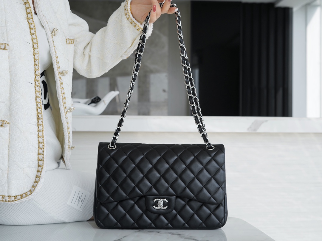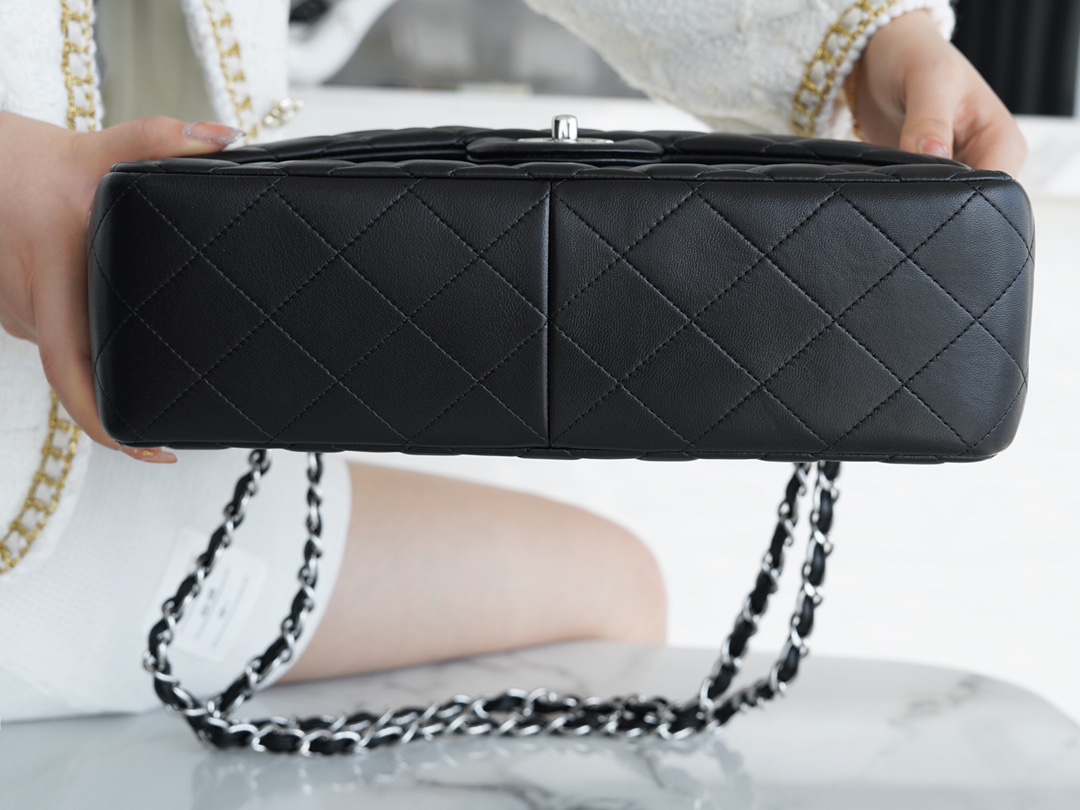 𝐂𝐇𝐀𝐍𝐄𝐋 Classic Flap Italy 🇮🇹 The 𝗚𝗥" Original Lambskin 🐑 Genuine Leather Large - Black Sheep Silver 🖤