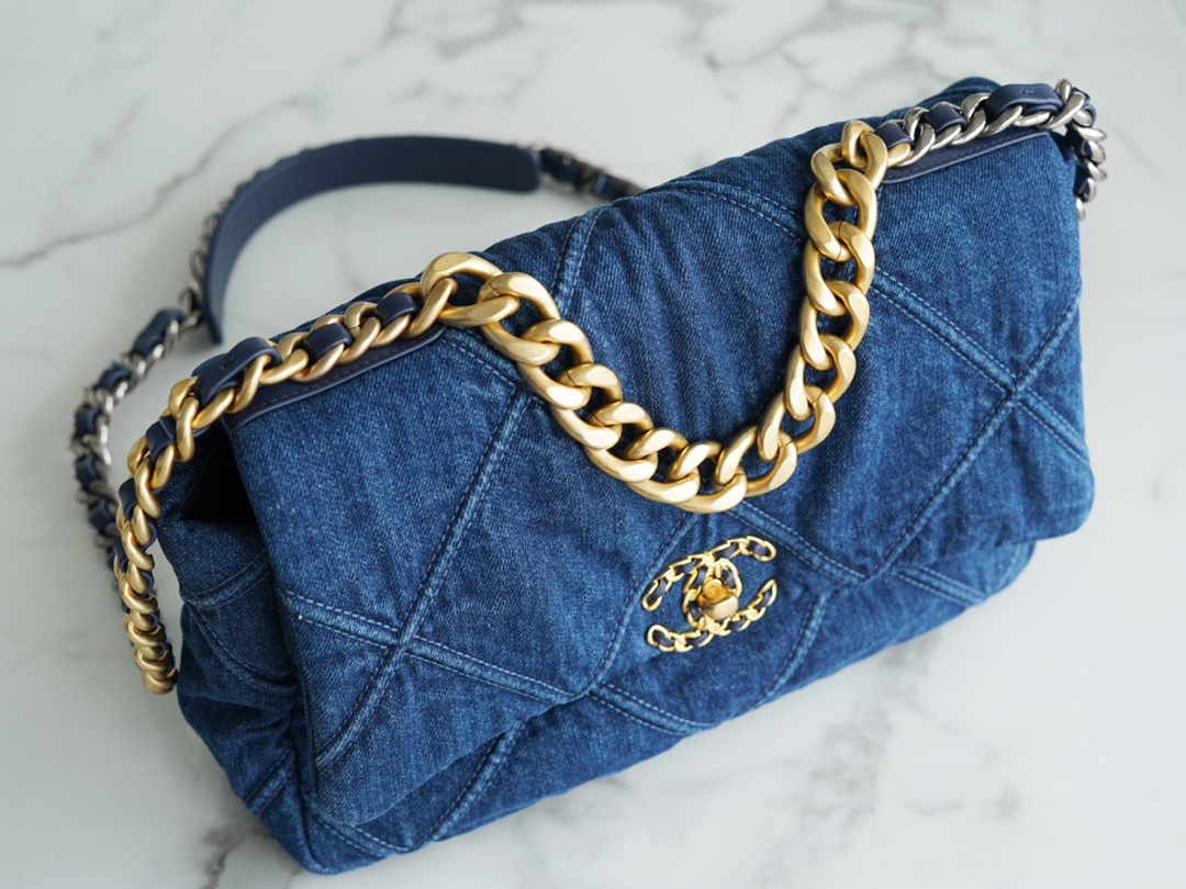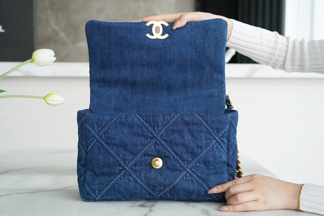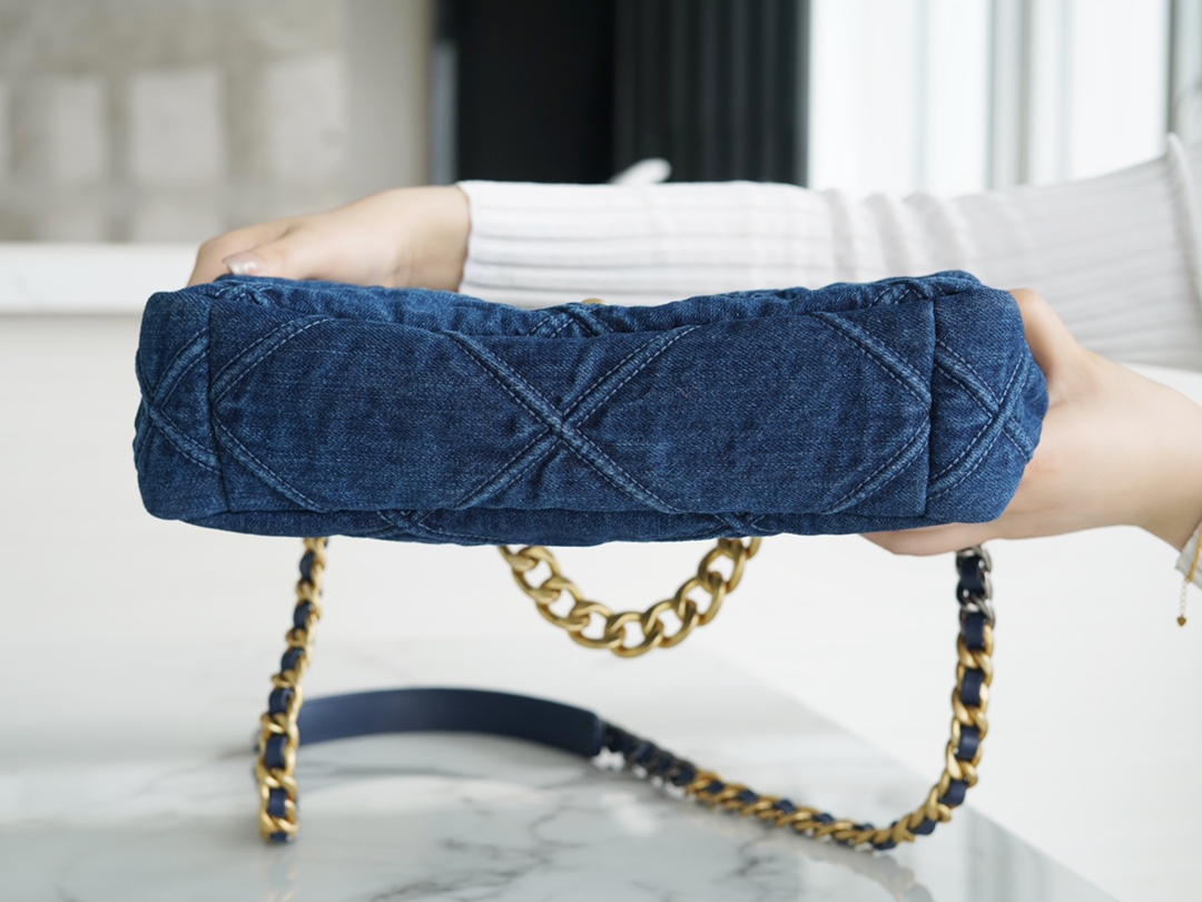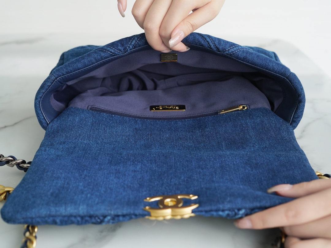 𝗖𝗛𝗔𝗡𝗘𝗟 ❶❾ 𝗕𝗔𝗚 Original Denim fabric series ❥ Genuine leather ❥ Small ❥𝟮𝟮𝗣 Denim Denim Denim Blue 🧢