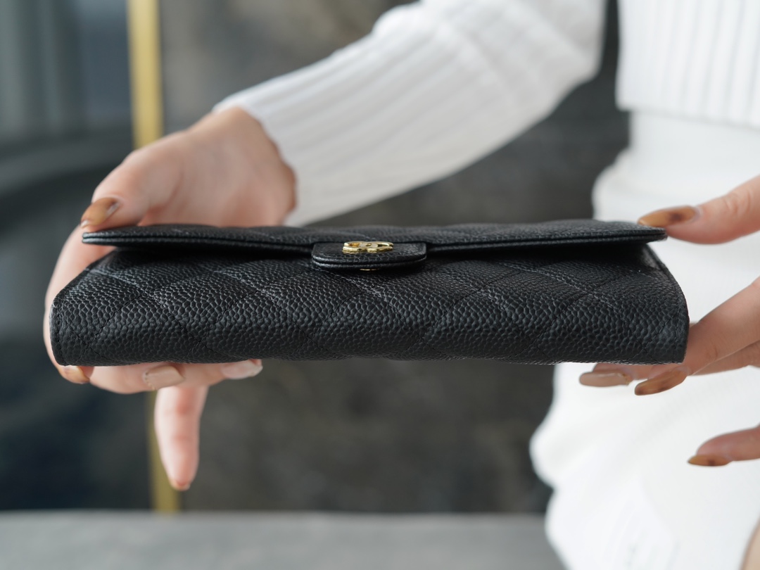 𝗖𝗛𝗔𝗘𝗡𝗟✦ 𝗖𝗹𝗮𝘀𝗶𝗰 𝗙𝗹𝗮𝗽 Using French 🇫🇷 import "𝗛𝗮𝘀𝘀𝘀" original calf leather 🐂 Classic two-fold long clip Black cow gold
